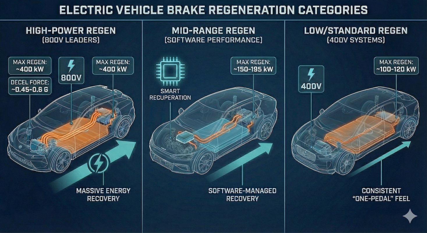 These cars have respectable regen but often rely on software "Track Modes" or blended braking to manage the energy flow.