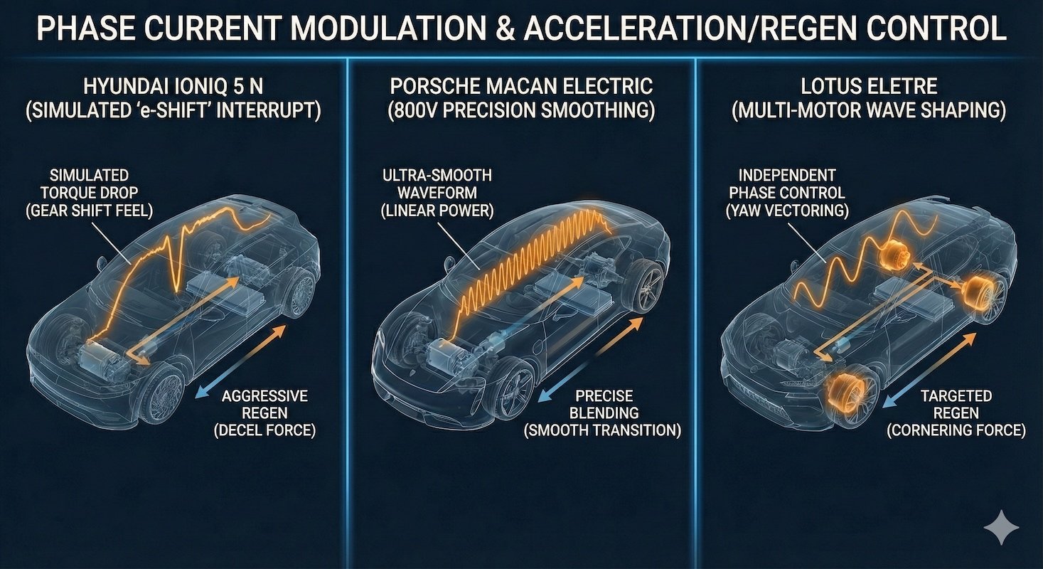Phase Current Modulation is the digital "shaping" of electrical waves that allows an EV to transition from maximum propulsion to maximum energy recovery in less than a millisecond, providing the sensation of an instant, seamless gear change in both directions.